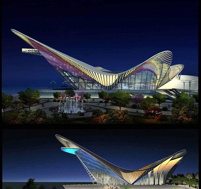 工程建筑面積31313平方米,其中地上8層,建筑高度66米。首層為設備用房及服務用房,層高6米。“鳳凰”的頭頸部匯集餐飲服務,在距地面52米處為設立蹦極平臺;腹部開放綜合餐飲和娛樂大廳;背部為可供游客游覽的綜合廣場;尾部規劃為可容納1200人的國際一流歌劇院。鳳凰之舟-(2) 鳳凰之舟-(1) 鳳凰之舟-(4)